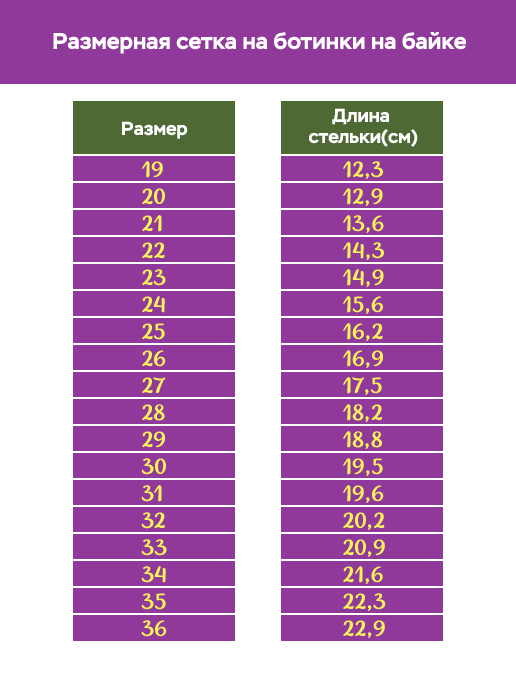 Данная модель ботинок выпускается с размерами от 23 до 36