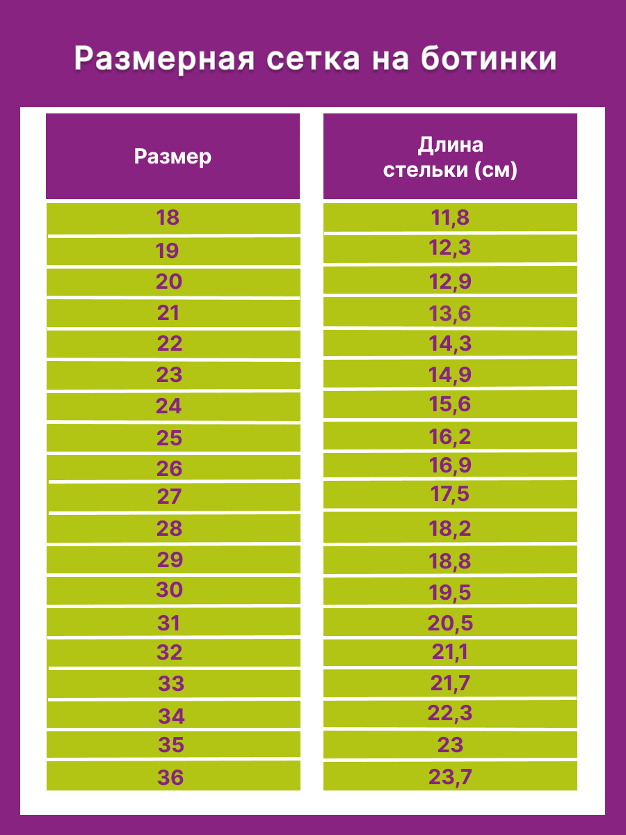 Данная модель ботинок выпускается с размерами от 26 до 36