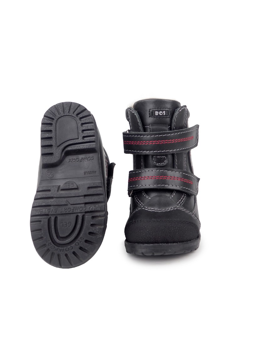 Утепленные ботинки из натуральной кожи премиум-класса и подкладки из шерстяного меха, согреют ножки ребенка. При выборе модели с шерстяным мехом, за счет плотности меха, рекомендуем выбирать детскую обувь на 1-1,5 размера больше. Внутри - съёмная стелька с активным супинатором. Жесткий задник надежно фиксирует голеностоп, а липучка "Велкро" помогает регулировать полноту. Умерено эластичная и прочная подошва с каблуком Томаса не скользит и хорошо поглощает ударную нагрузку, что позволяет ножкам ребенка не уставать.