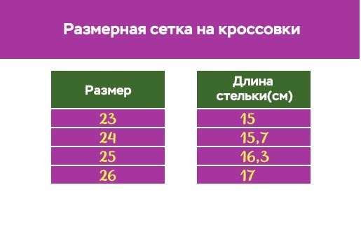 Данная модель кроссовок выпускается с размерами от 23 до 26