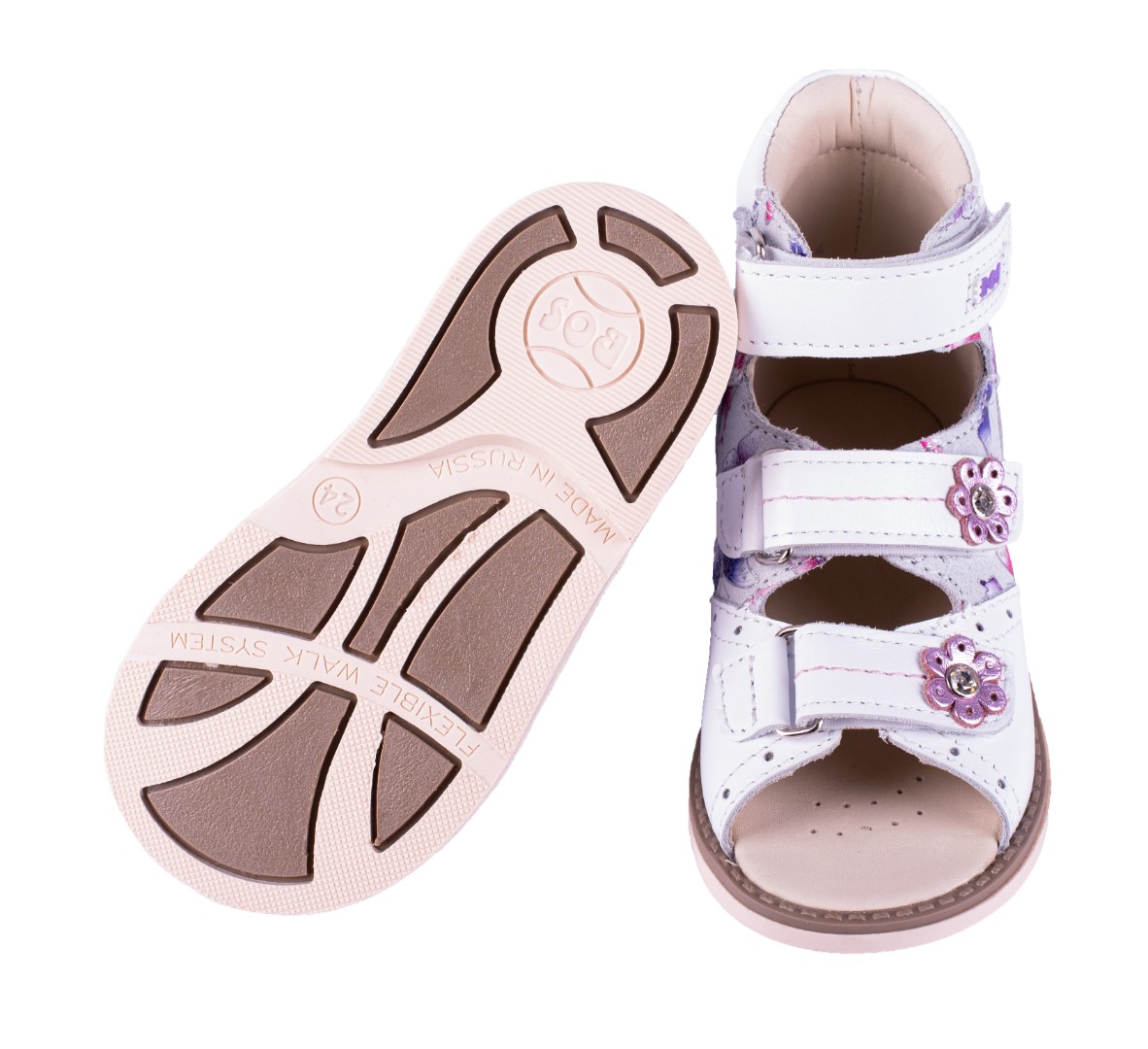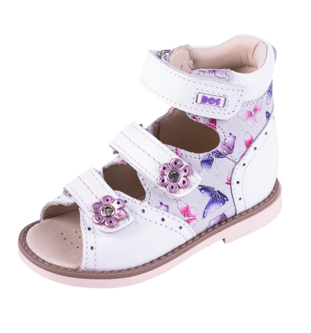Ортопедические сандалии с высоким берцем для профилактики и коррекции плоскостопия и плосковальгусной установки стоп. Широкий, устойчивый каблук специальной конфигурации - каблук Томаса. Каблук продлен с внутренней стороны до середины стопы, чтобы исключить заваливание стопы вовнутрь, так называемая косолапость, или вальгусная деформация. Ребра жесткости до середины стопы, анатомическая стелька без супинатора, (возможна вкладка своей индивидуальной стельки) для правильного формирования свода стопы. Задник максимальной жесткости с удлиненным крылом надежно стабилизирует голеностопный сустав во время ходьбы. Упругая, умеренно-эластичная подошва, имеющая перекат, позволяет повторить естественное движение стопы при ходьбе для правильного распределения нагрузки на опорно-двигательный аппарат ребенка.