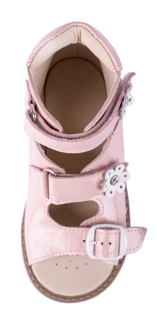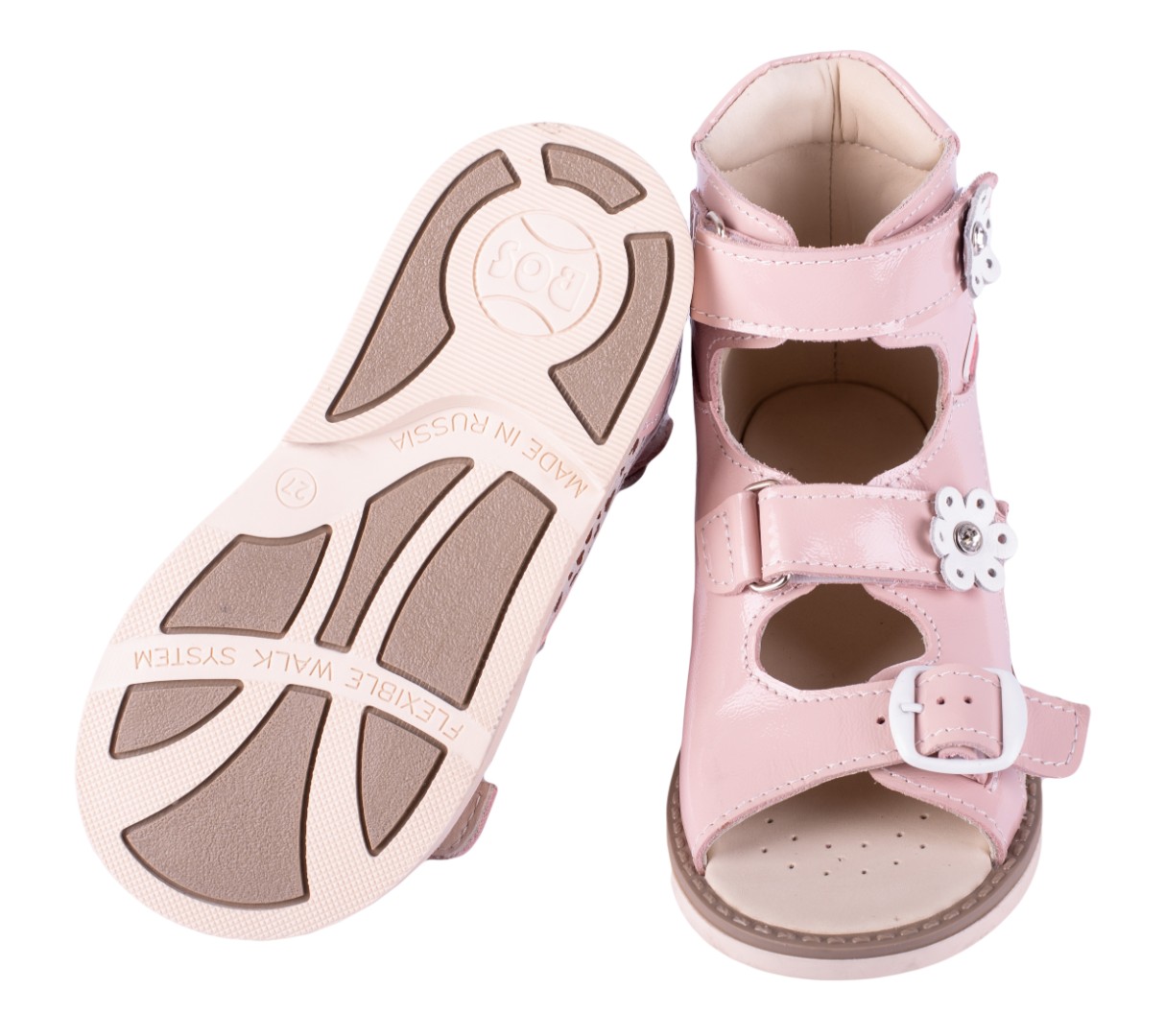 Ортопедические сандалии с высоким берцем для профилактики и коррекции плоскостопия и плосковальгусной установки стоп. Широкий, устойчивый каблук специальной конфигурации - каблук Томаса. Каблук продлен с внутренней стороны до середины стопы, чтобы исключить заваливание стопы вовнутрь, так называемая косолапость, или вальгусная деформация. Ребра жесткости до середины стопы, анатомическая стелька без супинатора, (возможна вкладка своей индивидуальной стельки) для правильного формирования свода стопы. Задник максимальной жесткости с удлиненным крылом надежно стабилизирует голеностопный сустав во время ходьбы. Упругая, умеренно-эластичная подошва, имеющая перекат, позволяет повторить естественное движение стопы при ходьбе для правильного распределения нагрузки на опорно-двигательный аппарат ребенка.
