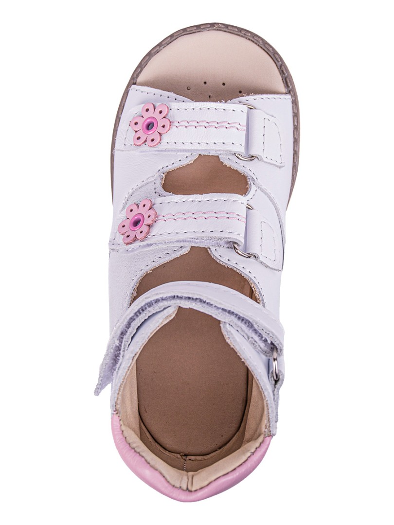 Ортопедические сандалии с высоким берцем для профилактики и коррекции плоскостопия и плосковальгусной установки стоп. Широкий, устойчивый каблук специальной конфигурации - каблук Томаса. Каблук продлен с внутренней стороны до середины стопы, чтобы исключить заваливание стопы вовнутрь, так называемая косолапость, или вальгусная деформация. Ребра жесткости до середины стопы, анатомическая стелька без супинатора, (возможна вкладка своей индивидуальной стельки) для правильного формирования свода стопы. Задник максимальной жесткости с удлиненным крылом надежно стабилизирует голеностопный сустав во время ходьбы. Упругая, умеренно-эластичная подошва, имеющая перекат, позволяет повторить естественное движение стопы при ходьбе для правильного распределения нагрузки на опорно-двигательный аппарат ребенка.