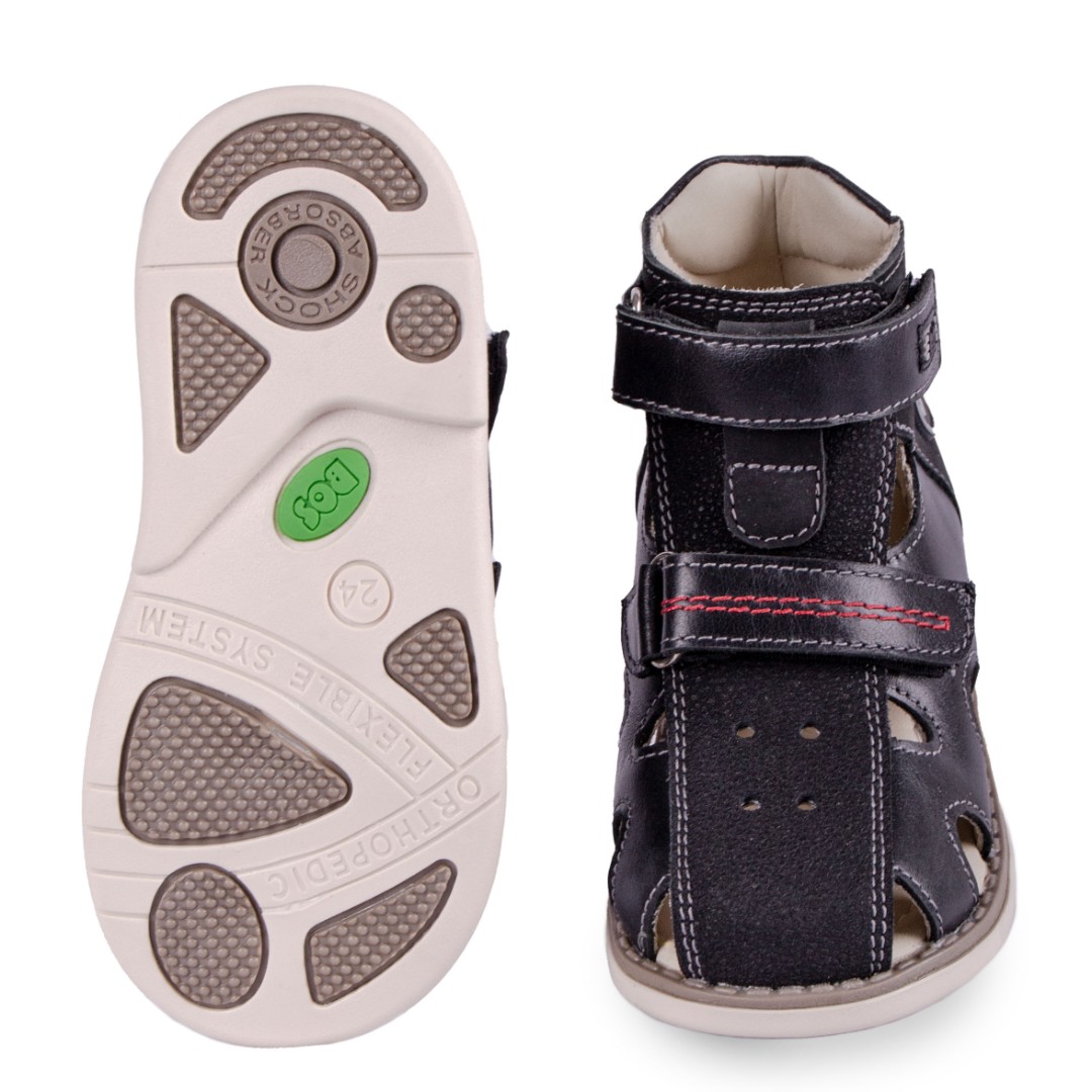 Сандалии для профилактики плоскостопия и плосковальгусной установки стоп. Широкий, устойчивый каблук специальной конфигурации - каблук Томаса. Каблук продлен с внутренней стороны до середины стопы, чтобы исключить заваливание стопы вовнутрь, так называемая косолапость, или вальгусная деформация. Анатомическая стелька с супинатором для правильного формирования свода стопы. Задник максимальной жесткости с удлиненным крылом надежно стабилизирует голеностопный сустав во время ходьбы. Упругая, умеренно-эластичная подошва, имеющая перекат, позволяет повторить естественное движение стопы при ходьбе для правильного распределения нагрузки на опорно-двигательный аппарат ребенка.