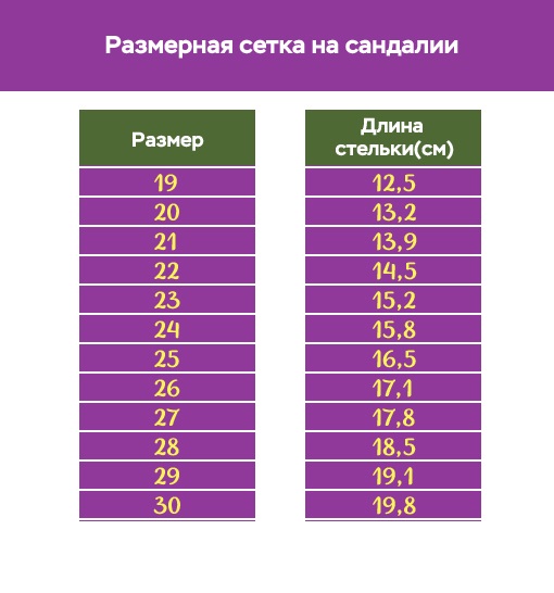 Данная модель сандаликов выпускается с размерами от 19 до 30