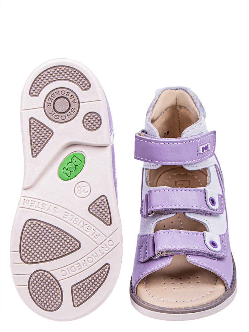 Ортопедические сандалии для профилактики и коррекции плоскостопия и плосковальгусной установки стоп. Широкий, устойчивый каблук специальной конфигурации - каблук Томаса. Каблук продлен с внутренней стороны до середины стопы, чтобы исключить заваливание стопы вовнутрь, так называемая косолапость, или вальгусная деформация. Анатомическая стелька с супинатором для правильного формирования свода стопы. Задник максимальной жесткости с удлиненным крылом надежно стабилизирует голеностопный сустав во время ходьбы. Упругая, умеренно-эластичная подошва, имеющая перекат, позволяет повторить естественное движение стопы при ходьбе для правильного распределения нагрузки на опорно-двигательный аппарат ребенка.
