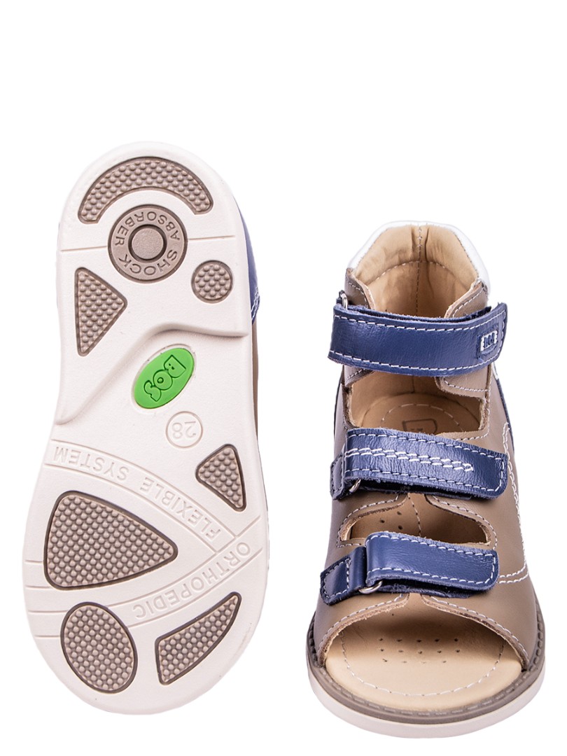 Сандалии для профилактики плоскостопия и плосковальгусной установки стоп. Широкий, устойчивый каблук специальной конфигурации - каблук Томаса. Каблук продлен с внутренней стороны до середины стопы, чтобы исключить заваливание стопы вовнутрь, так называемая косолапость, или вальгусная деформация. Анатомическая стелька с супинатором для правильного формирования свода стопы. Задник максимальной жесткости с удлиненным крылом надежно стабилизирует голеностопный сустав во время ходьбы. Упругая, умеренно-эластичная подошва, имеющая перекат, позволяет повторить естественное движение стопы при ходьбе для правильного распределения нагрузки на опорно-двигательный аппарат ребенка.