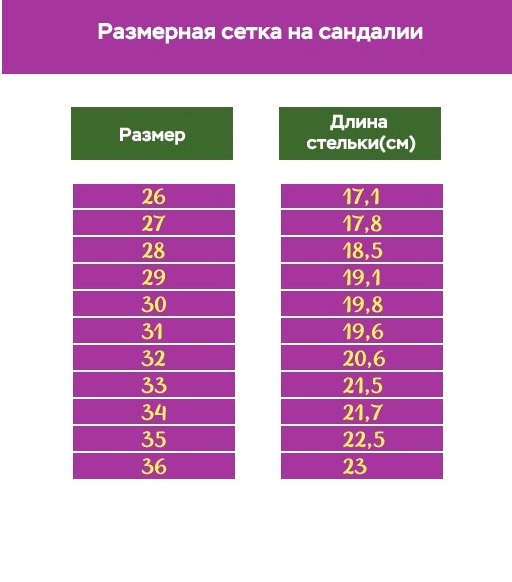 Данная модель сандаликов выпускается с размерами от 26 до 36