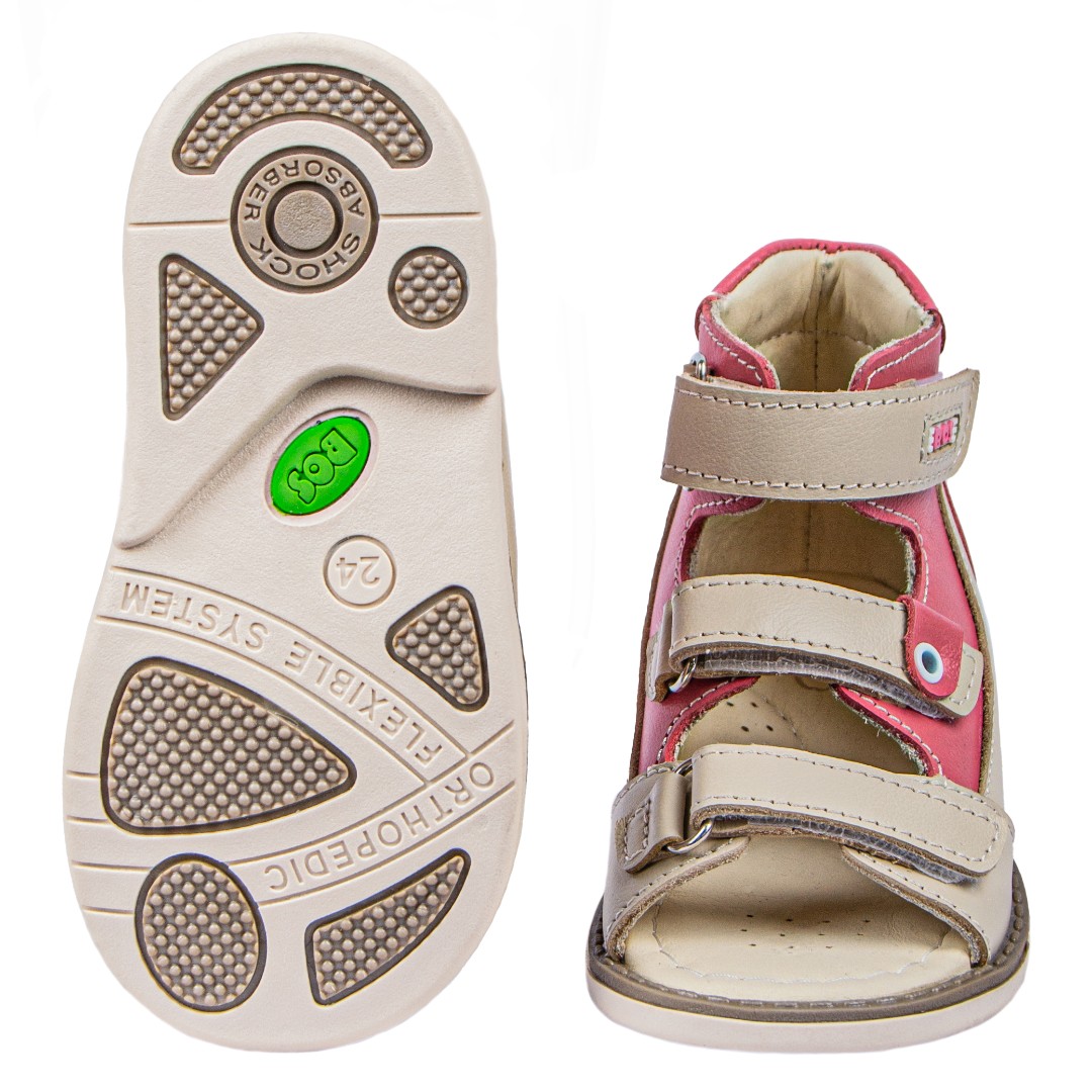 Ортопедические сандалии для профилактики и коррекции плоскостопия и плосковальгусной установки стоп. Широкий, устойчивый каблук специальной конфигурации - каблук Томаса. Каблук продлен с внутренней стороны до середины стопы, чтобы исключить заваливание стопы вовнутрь, так называемая косолапость, или вальгусная деформация. Анатомическая стелька с супинатором для правильного формирования свода стопы. Задник максимальной жесткости с удлиненным крылом надежно стабилизирует голеностопный сустав во время ходьбы. Упругая, умеренно-эластичная подошва, имеющая перекат, позволяет повторить естественное движение стопы при ходьбе для правильного распределения нагрузки на опорно-двигательный аппарат ребенка.