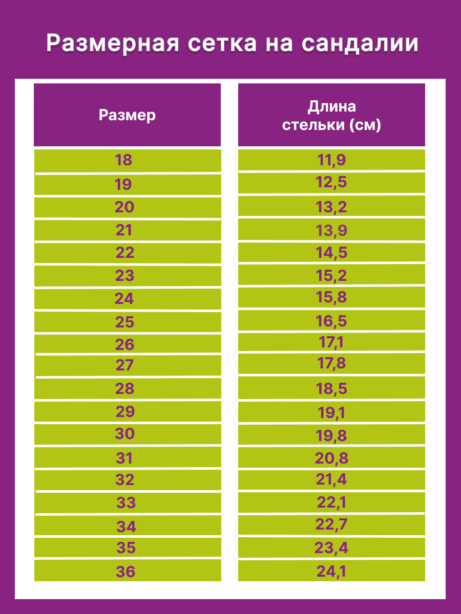 Данная модель сандаликов выпускается с размерами от 23 до 36