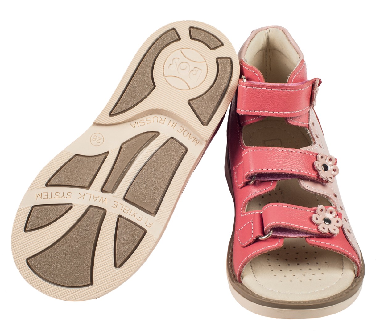 Ортопедические сандалии для профилактики и коррекции плоскостопия и плосковальгусной установки стоп. Широкий, устойчивый каблук специальной конфигурации - каблук Томаса. Каблук продлен с внутренней стороны до середины стопы, чтобы исключить заваливание стопы вовнутрь, так называемая косолапость, или вальгусная деформация. Анатомическая стелька с супинатором для правильного формирования свода стопы. Задник максимальной жесткости с удлиненным крылом надежно стабилизирует голеностопный сустав во время ходьбы. Упругая, умеренно-эластичная подошва, имеющая перекат, позволяет повторить естественное движение стопы при ходьбе для правильного распределения нагрузки на опорно-двигательный аппарат ребенка